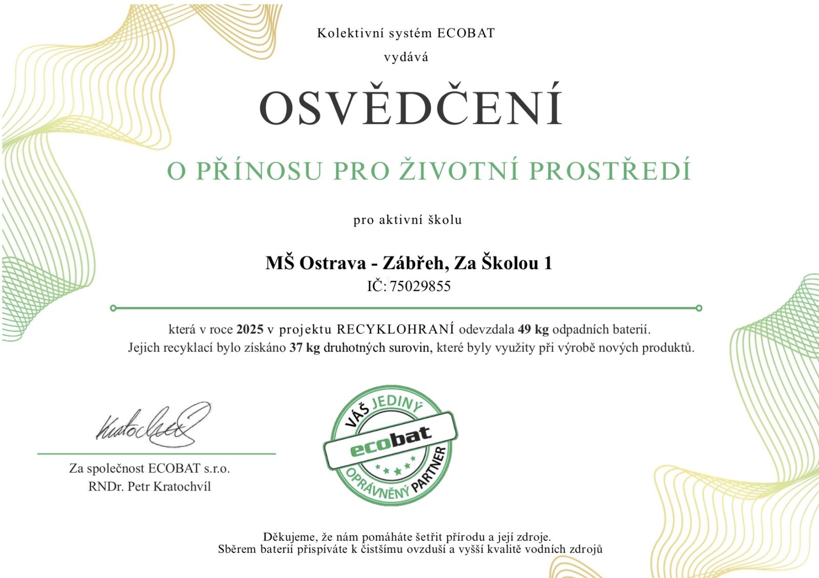 Velmi si vážíme Vaší spolupráce, díky které u dětí rozvíjíme odpovědný přístup k ochraně životního prostředí i praktické návyky v třídění odpadu.
